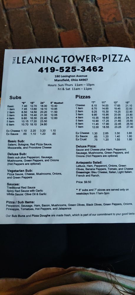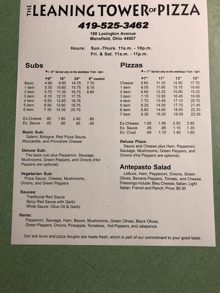 Introducing "The Leaning Tower Of Pizza," a beloved fixture in Mansfield since 1957, this charming eatery serves up a delightful menu featuring both mouthwatering pizzas and satisfying submarine sandwiches. Patrons rave about the handmade crust that strikes a perfect balance—medium thickness, great chewiness, and a delightful crisp. The signature cheese, described as "stretchy ooey gooey goodness," adds an indulgent touch to every slice.